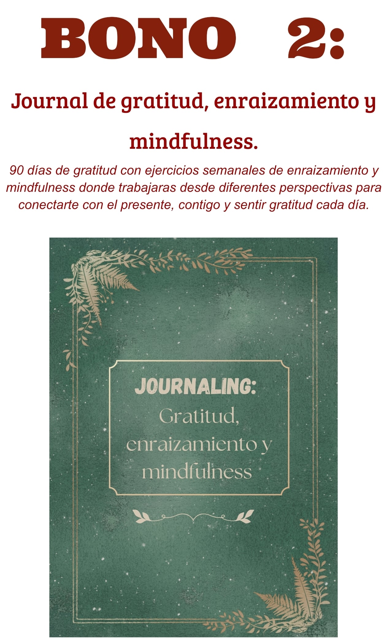 - Prácticas diarias para reconectarte y regularte: más de 50 ejercicios de escritura terapéutica, kinesiología energética, ejercicios psico-corporales, respiraciones, rituales, preguntas de coaching, prácticas de expresión emocional y corporal, etc